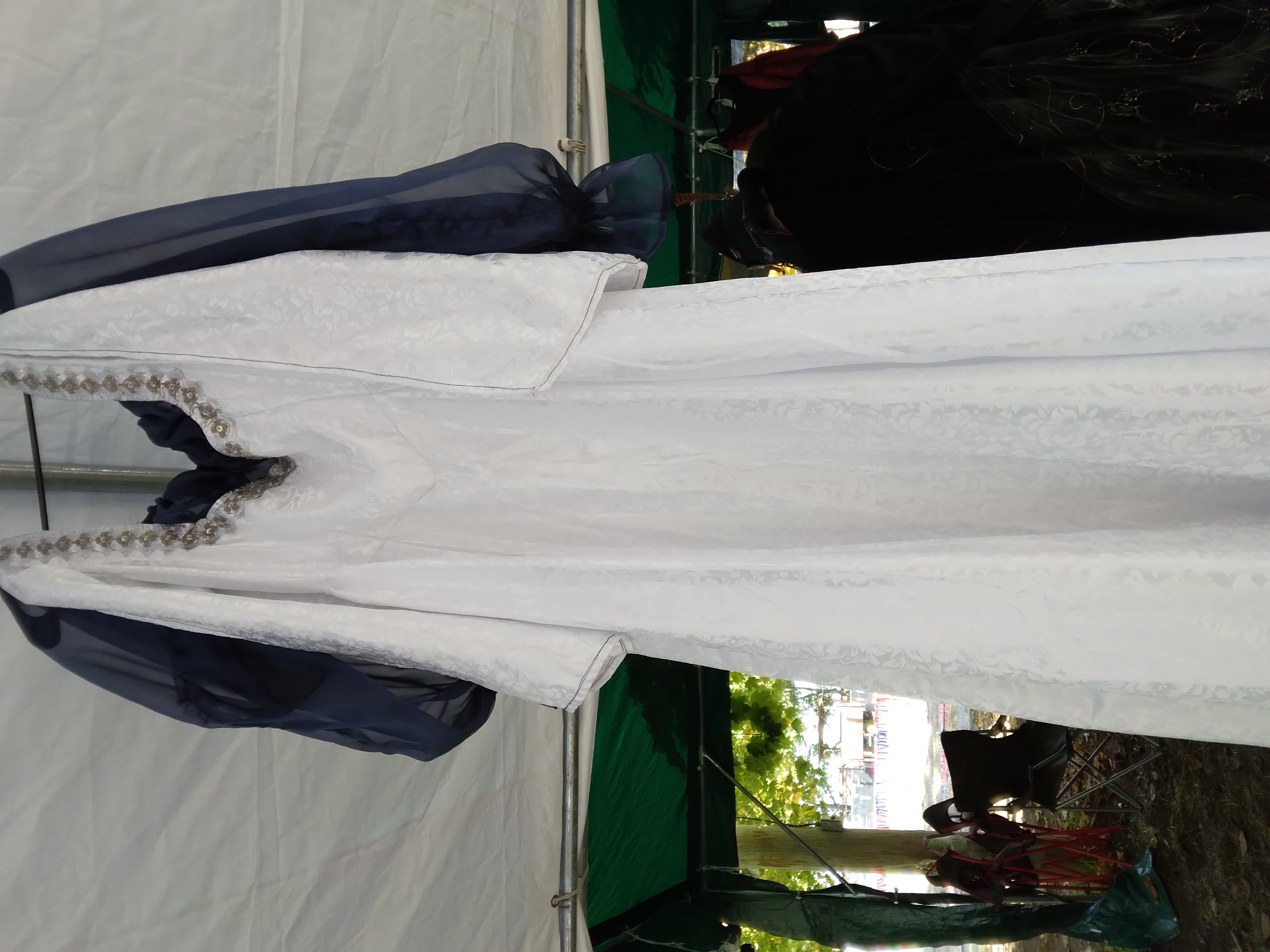 This Gown is called the Winter Queen - made of Brocade with sleeves and neckline made in Oraganza. there is a modest train that can be bustled if needed. Dress can be worn with a hoop underneath.